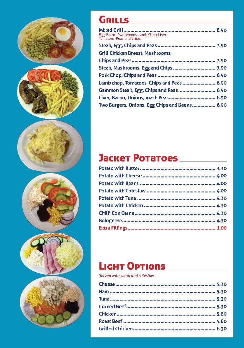 The menu at Cafe Blue offers a straightforward selection of classic café fare and breakfast favourites, ideal for a relaxed start to the day or a comforting midday pause. You’ll find simple, hearty options like a Full English Breakfast, omelettes, and variations of chips served with beans or other toppings. The casual, welcoming vibe is reflected in dishes such as a cheese and bacon panini or spaghetti bolognese with chips—meals that feel familiar and satisfying without fuss.